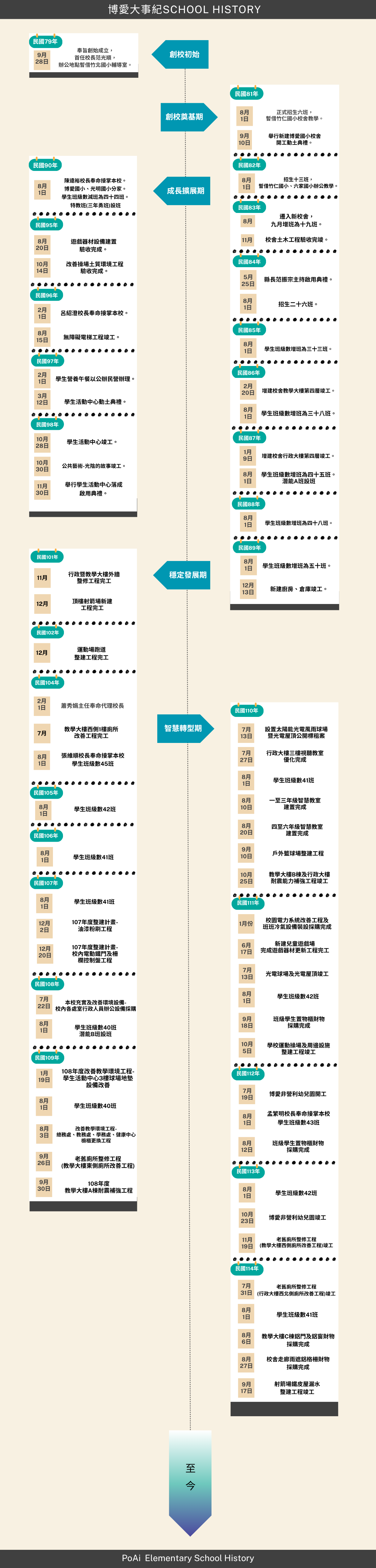正式招生、動土典禮、遷入新校舍,班級數逐年增加。